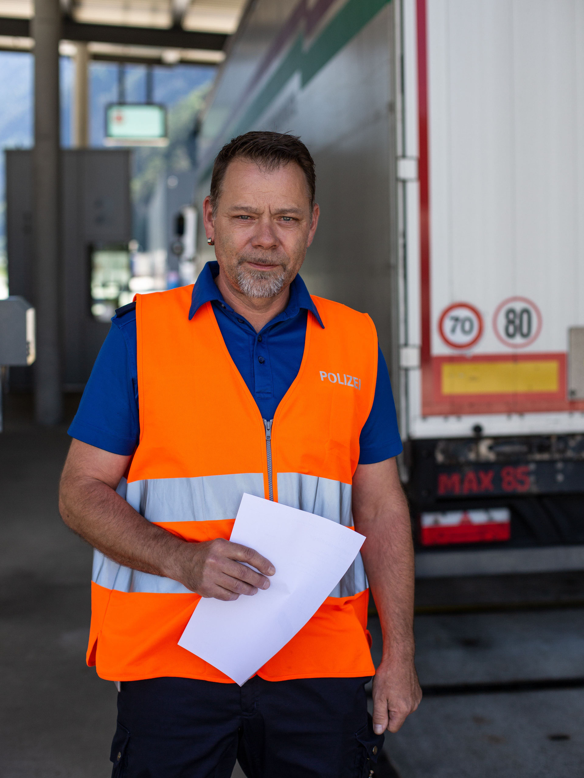 Nach gut 30 Minuten ist die Kontrolle auf dem Prüfstand beendet. Jetzt muss der ukrainische Chauffeur seinen Laster parkieren, bevor in der Schalterhalle sämtliche Formalitäten erledigt werden. Der Chauffeur wartet hinter der Glasscheibe mit aufgestütztem Ellbogen, während Eduard Gisler die Daten aus der Kontrolle auswertet.