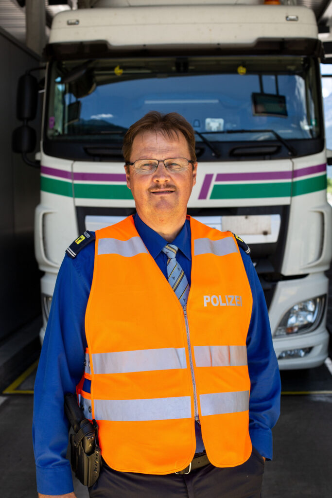 Nachmittags um halb drei. Es ist ein sonniger Julitag im Schwerverkehrszentrum Uri. Christof Theiler kriecht unter einen Lastwagen und inspiziert mit der Taschenlampe die Unterseite des Trucks – ein Anhängerzug mit polnischen Kontrollschildern. Seine Arbeit ist körperlich anstrengend: «Wenn man eine Woche lang nicht arbeitet, muss man weniger essen», scherzt der 48-Jährige, der hier seit vier Jahren als technischer Kontrolleur arbeitet. Theiler leuchtet auf die Stossdämpfer und sagt: «Hier rostet es ziemlich. Das ist verdächtig.» Erst vorgestern habe er nämlich einen Lastwagen kontrolliert, bei dem die Stossdämpfer gerissen waren.